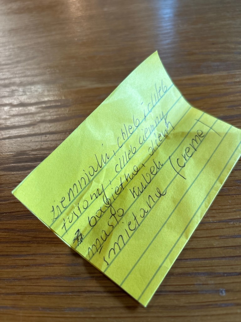 I come back to the present. Back to my reality. I now have a yellow lined stump of a paper with someone else’s shopping list in Polish. I hope they got their messages before the drop.